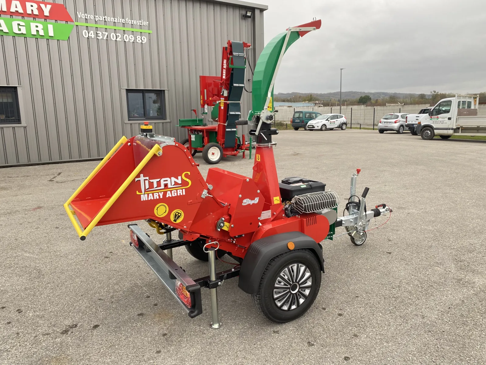 Broyeur de végétaux sur châssis routier homologué pour la route, moteur essence et démarreur électrique.